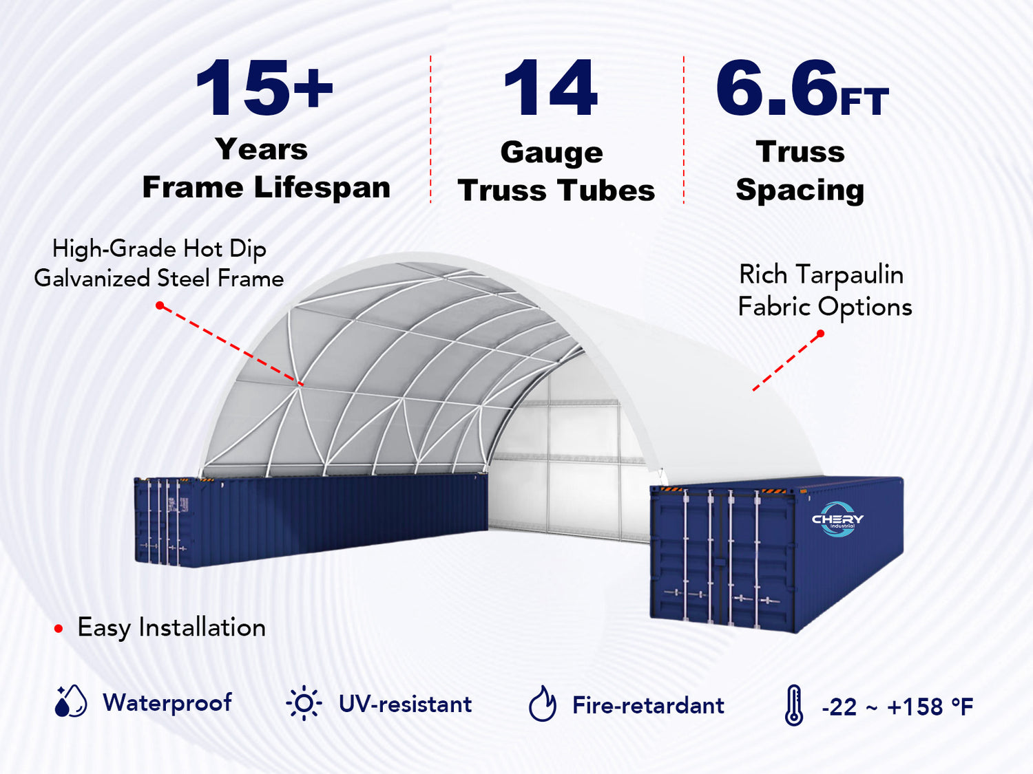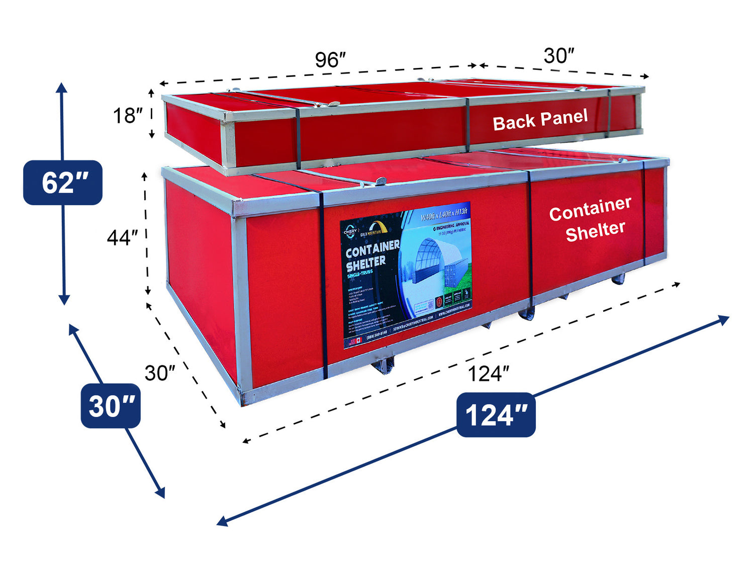 The 40x40x13 ft Container Shelter with Closed Back Panel features a durable 11oz PE tarpaulin and a sturdy PE back panel. This spacious, high-quality shelter provides excellent protection, perfect for various uses in demanding environments.