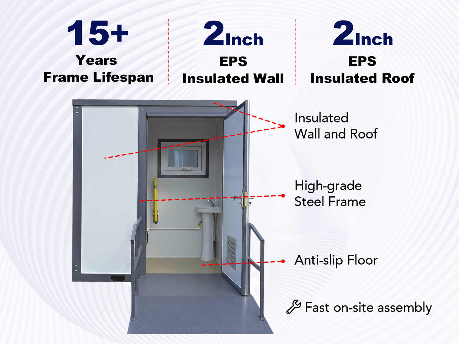 - If used on a construction site, we recommend you connect toilets to the sanitary sewer system and connect water to the pipe system. If not, you may need tanks outside the structure for waste.