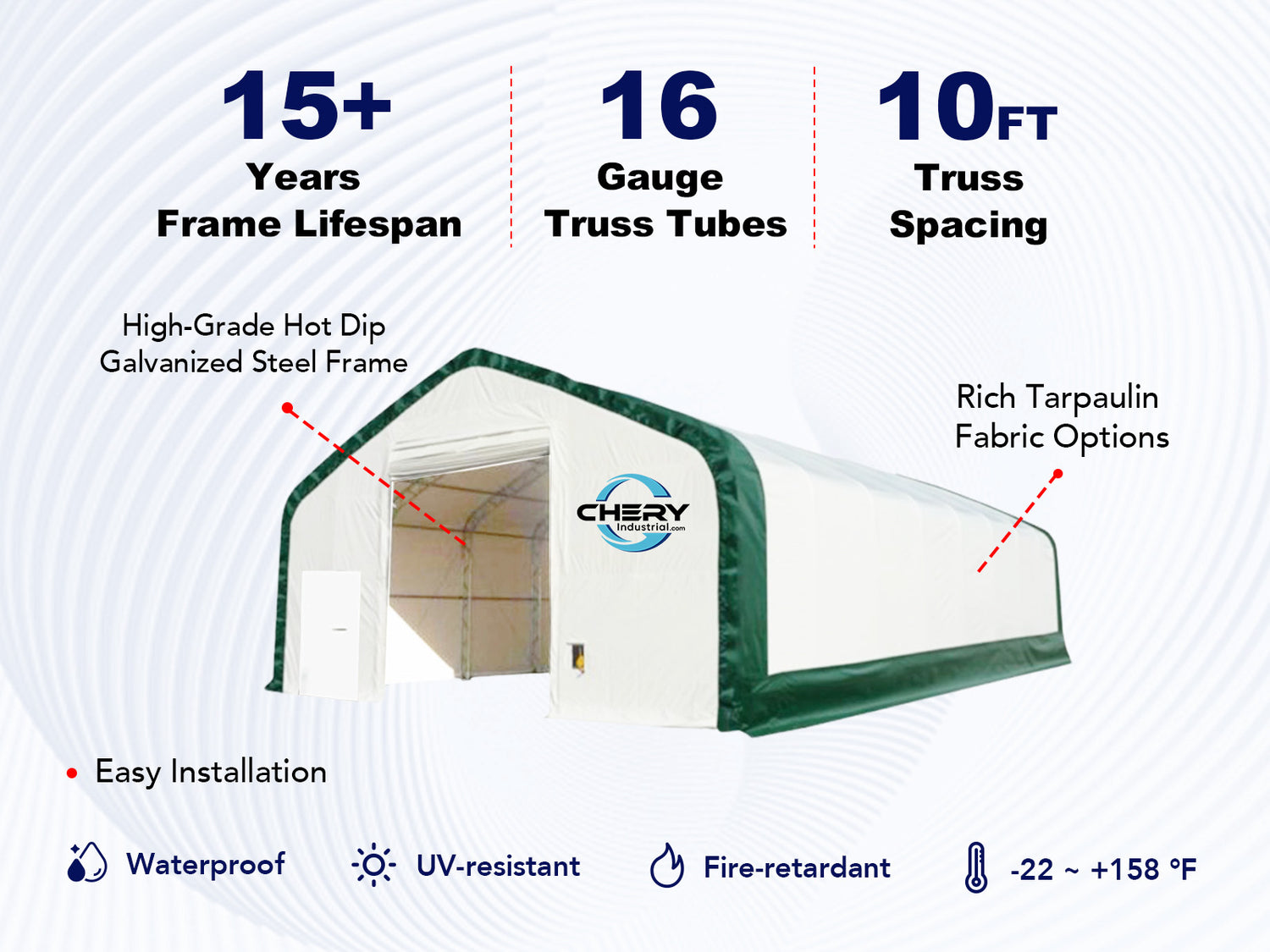 Durable Construction: 16-gauge galvanized steel truss frame is robust and durable. The 23 oz PVC canopy is water-resistant, UV-resistant, fire-restardant, and perfect for all weather protection.