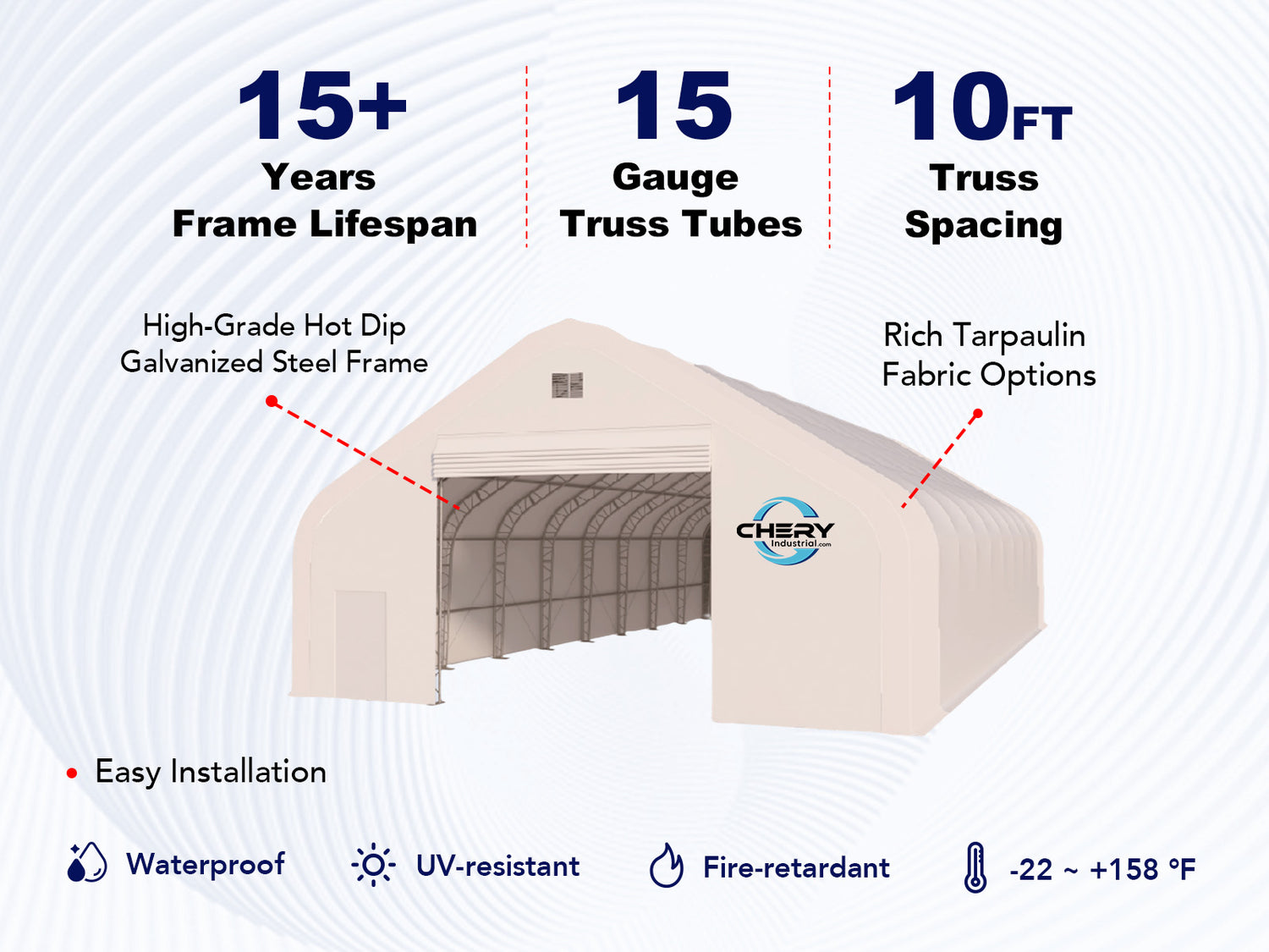Durable Material: The shelter’s dual truss design and 15 gauge zinc-coated steel frame deliver exceptional strength, while the water- and UV-resistant PVC canopy ensures reliable protection against the elements.
