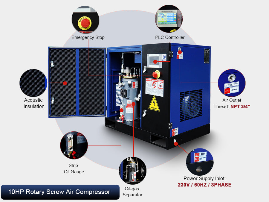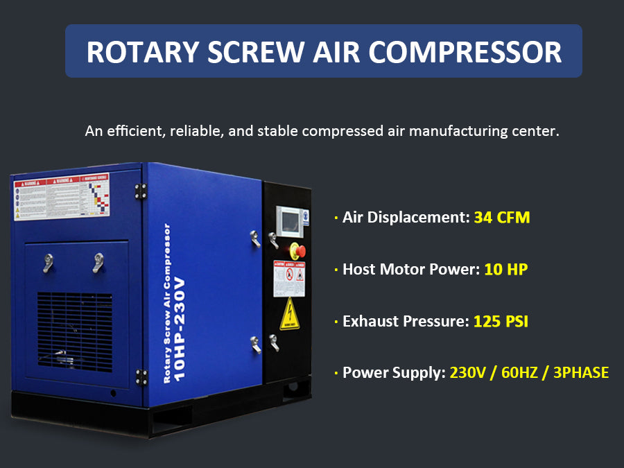 - 10HP Rotary Screw Air Compressor – 34 CFM, 125 PSI, 230V 3-Phase 60HZ