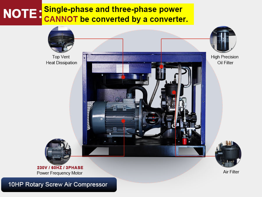 - Power Configuration: Motor power of 7.5KW / 10 HP, power supply of 230V / 60HZ / 3PHASE.