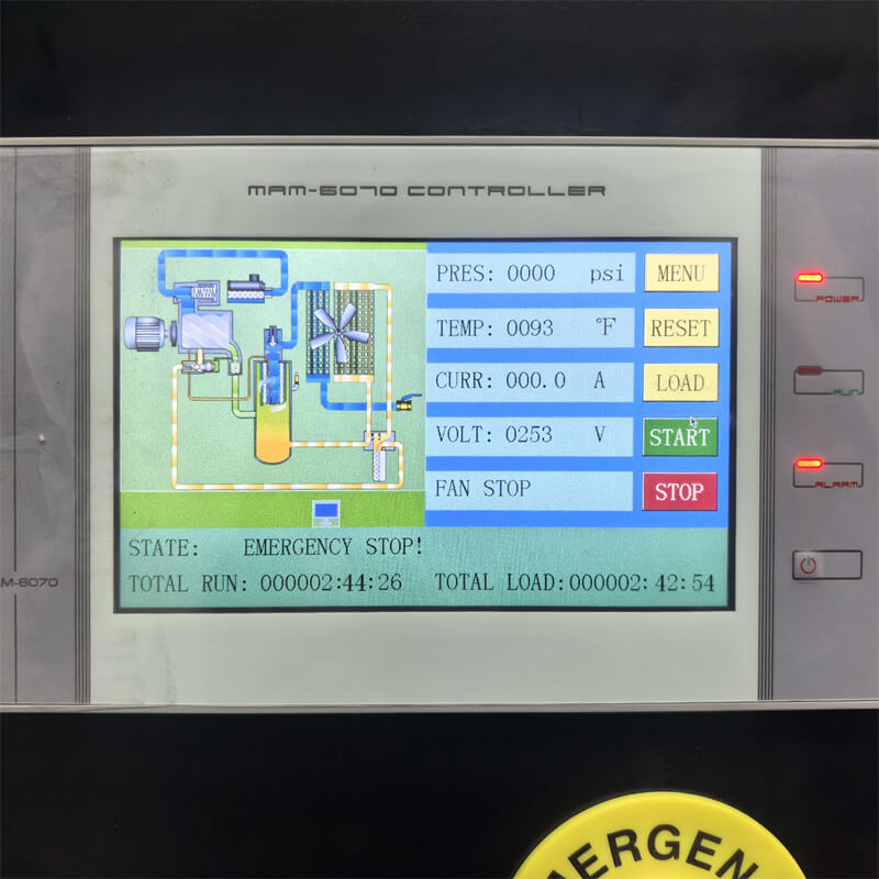 Monitors maintenance, temperature readings, pressure settings, oil level, filtration & hours, also monitors remote start/stop. A mechanical switch is also provided.