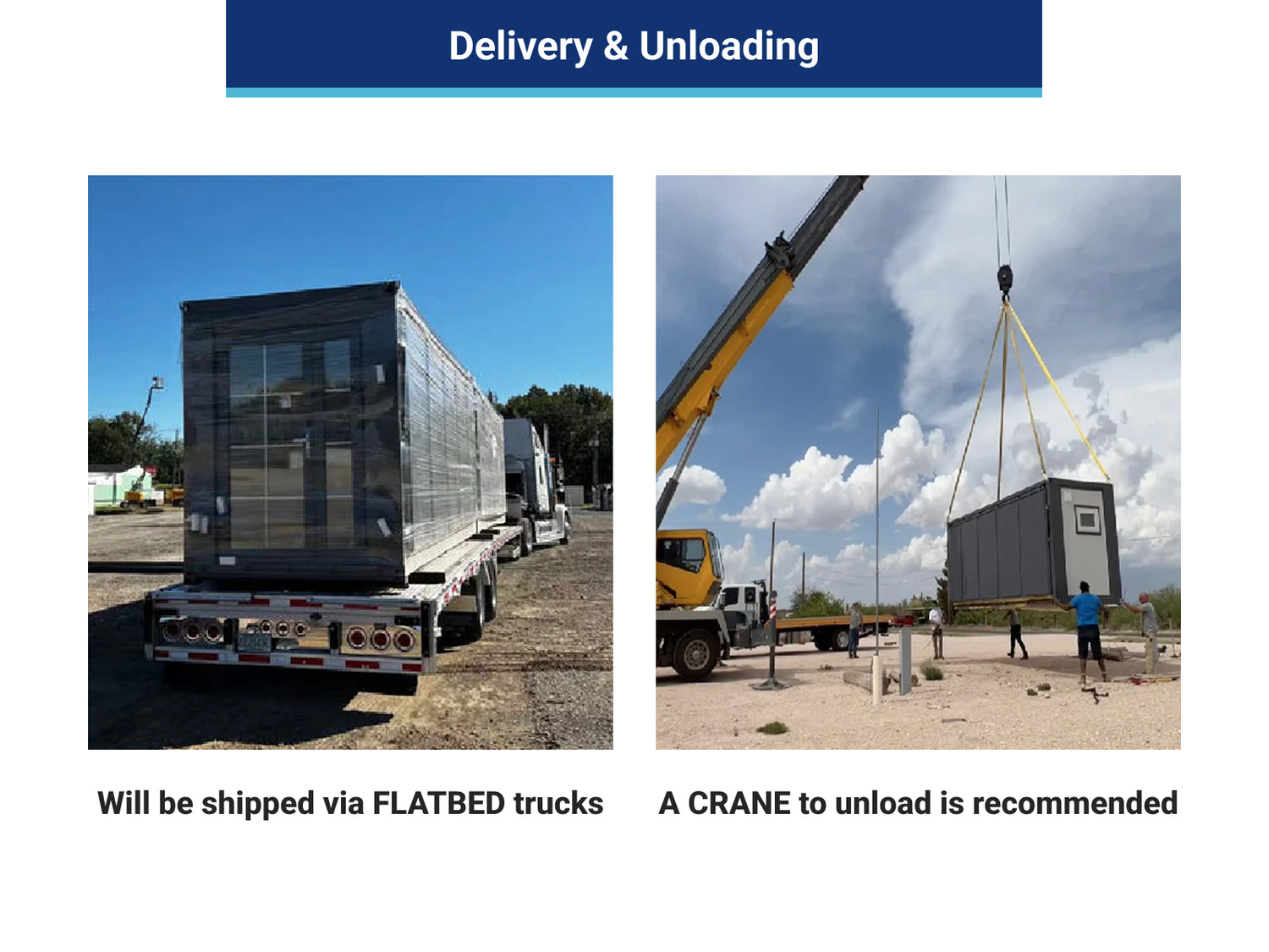 Due to the extra-large size, the product will be shipped via flatbed trucks, and it is the customer's responsibility to unload the product from the trucks. Please have forklifts or a crane ready to unload. Please make sure the forklift has enough capacity to unload and balance the product when unloading. A crane is recommended.
