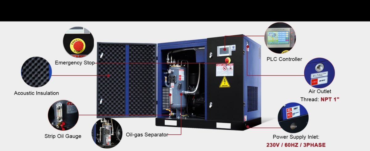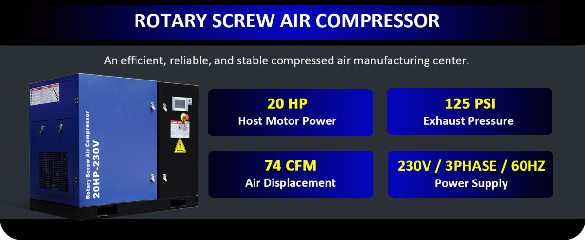 - 20HP Rotary Screw Air Compressor, 74CFM, 125PSI, 230V 3PHASE 60HZ