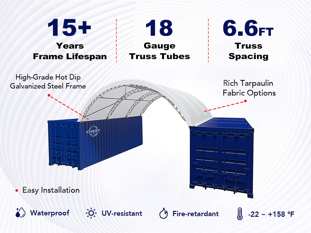 The Fortified 20'x20' Double Truss Container Shelter is engineered for superior strength, stability, and long-term outdoor protection. Built with a reinforced double truss galvanized steel frame, upgraded joint connections with shrink fittings and sleeves, and added diagonal bracing, this shelter delivers outstanding resistance against wind and snow. The heavy-duty PVC cover provides reliable waterproof and UV protection for year-round use. With strengthened base anchors and precision engineering, this shelter is ideal for equipment storage, vehicle protection, and industrial applications in demanding environments.