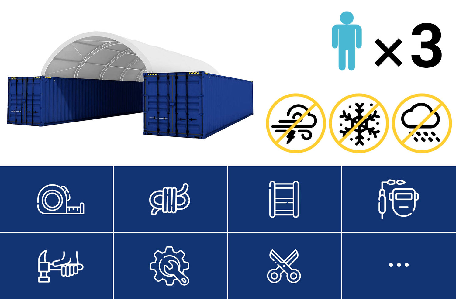 The Fortified 20'x40' Double Truss Container Shelter features a reinforced structure for enhanced stability and wind resistance, making it stronger than standard models. Designed for heavy-duty protection, it offers superior durability against harsh weather conditions. Easy to install on shipping containers, this shelter provides reliable, long-term coverage for equipment, vehicles, and materials in industrial, agricultural, and commercial settings.