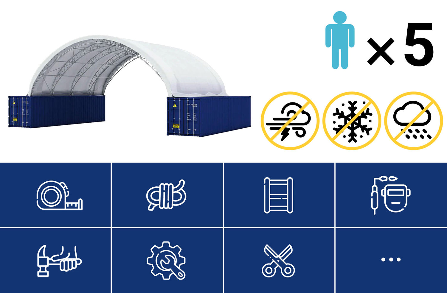 The Fortified 50'x40'x17' Double Truss Container Shelter is designed to withstand harsh conditions and heavy usage. Its advanced frame features an arch with a shrink head and jacket for added strength, while the arch is supported by diagonal steel pipes on both sides, enhancing overall stability. With a robust construction of Arch Ø60x1.5 and Purlin Ø48x1.5, this shelter ensures maximum structural integrity and resilience against wind, snow, and other environmental stressors.