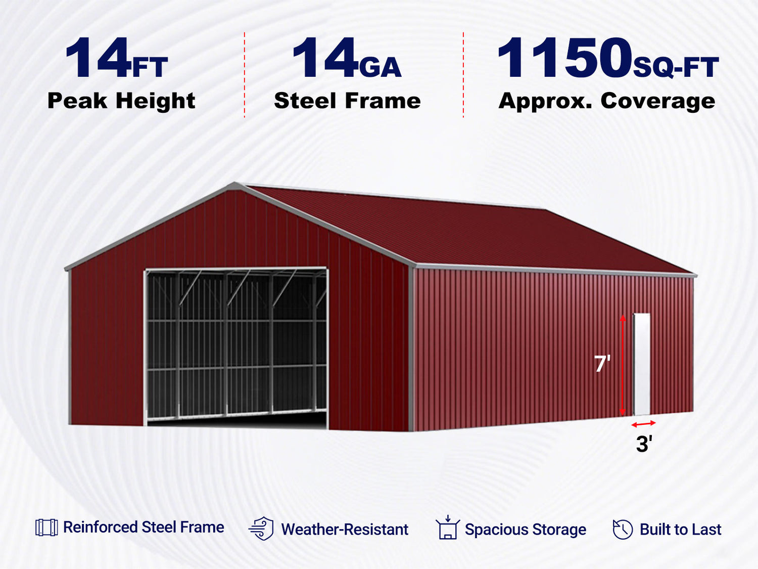 Built with a reinforced 14-gauge galvanized square-tube frame and strengthened roof structure, this extra-tall steel building delivers outstanding durability and weather resistance. The heavy-duty 26-gauge steel panels and reddish-brown finish provide long-lasting protection and a professional appearance.