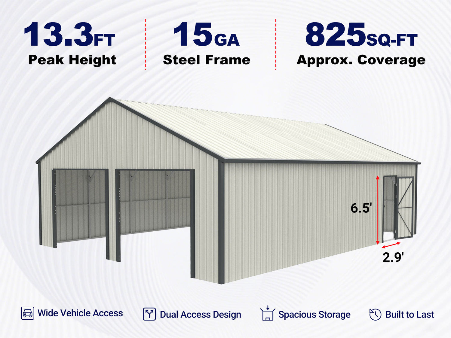 Introducing the W25'xL32.6'xH13.3' Double Garage Metal Shed, featuring a side entry door for easy access. Constructed with a robust 15 GA galvanized steel frame and a horizontal grain 3-layer splicing design, this shed offers 8' wall height for ample storage space. Durable, stylish, and built to last!