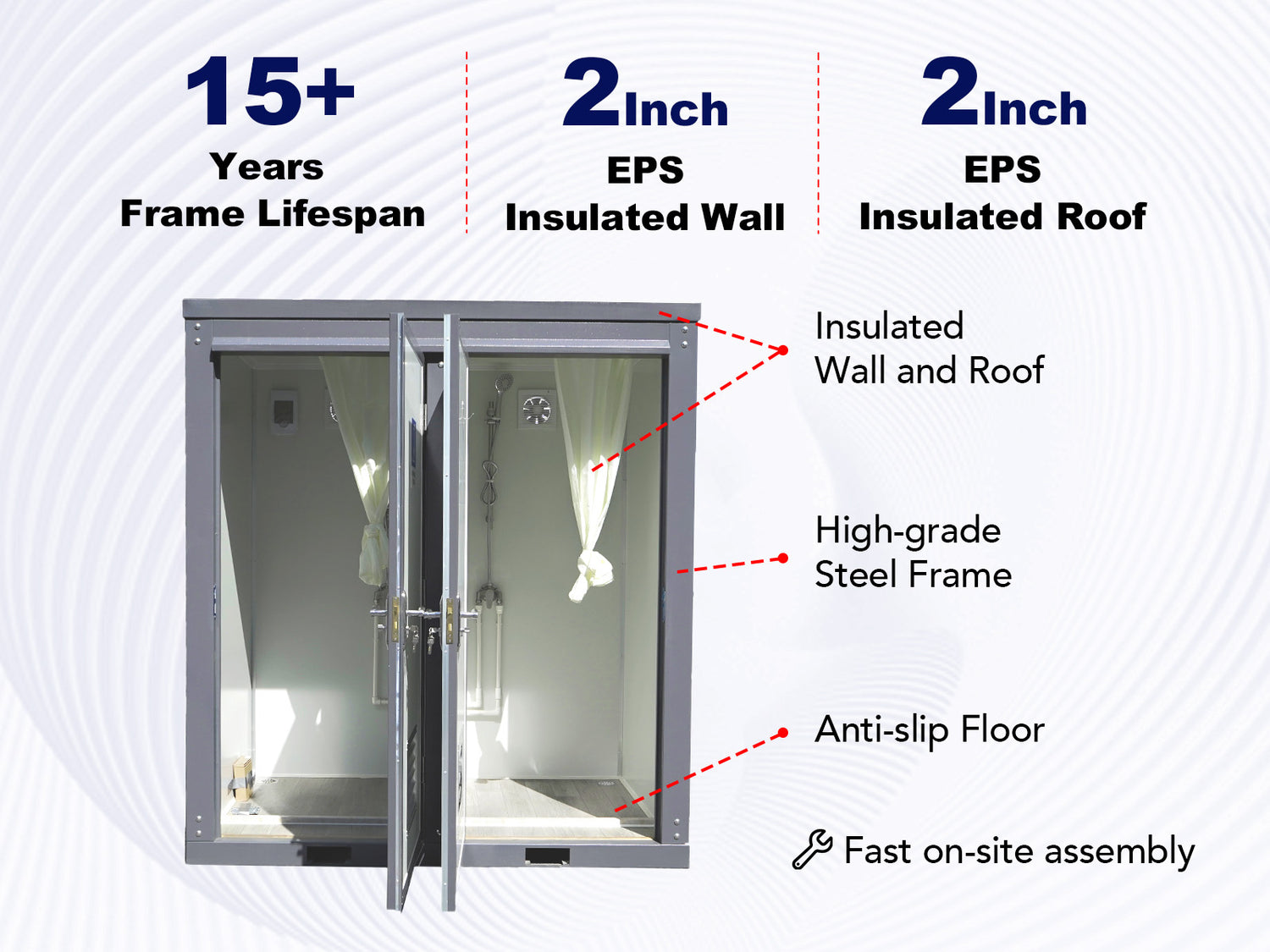 - If used on a construction site, we recommend you connect toilets to the sanitary sewer system and connect water to the pipe system. If not, you may need tanks outside the structure for waste.