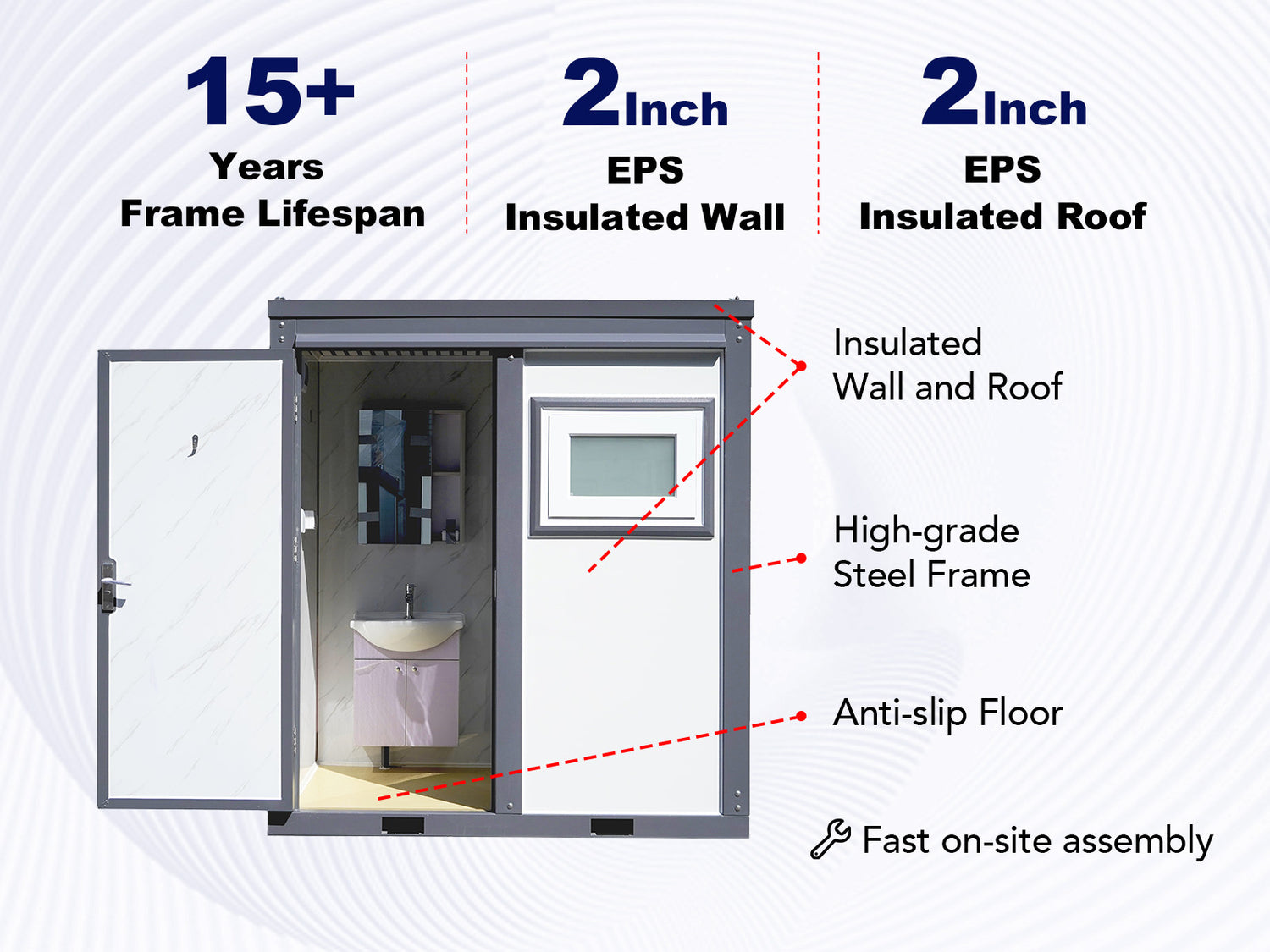 - If used on a construction site, we recommend you connect toilets to the sanitary sewer system and connect water to the pipe system. If not, you may need tanks outside the structure for waste.