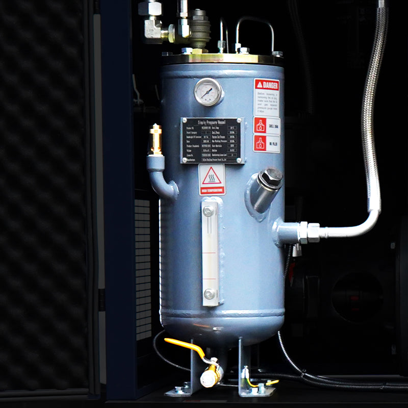 The oil receiver tank ensures highly efficient oil-air separation and delivers cleaner, drier compressed air. Its robust construction guarantees minimal pressure drop, contributing directly to reduced energy consumption and stable system pressure.