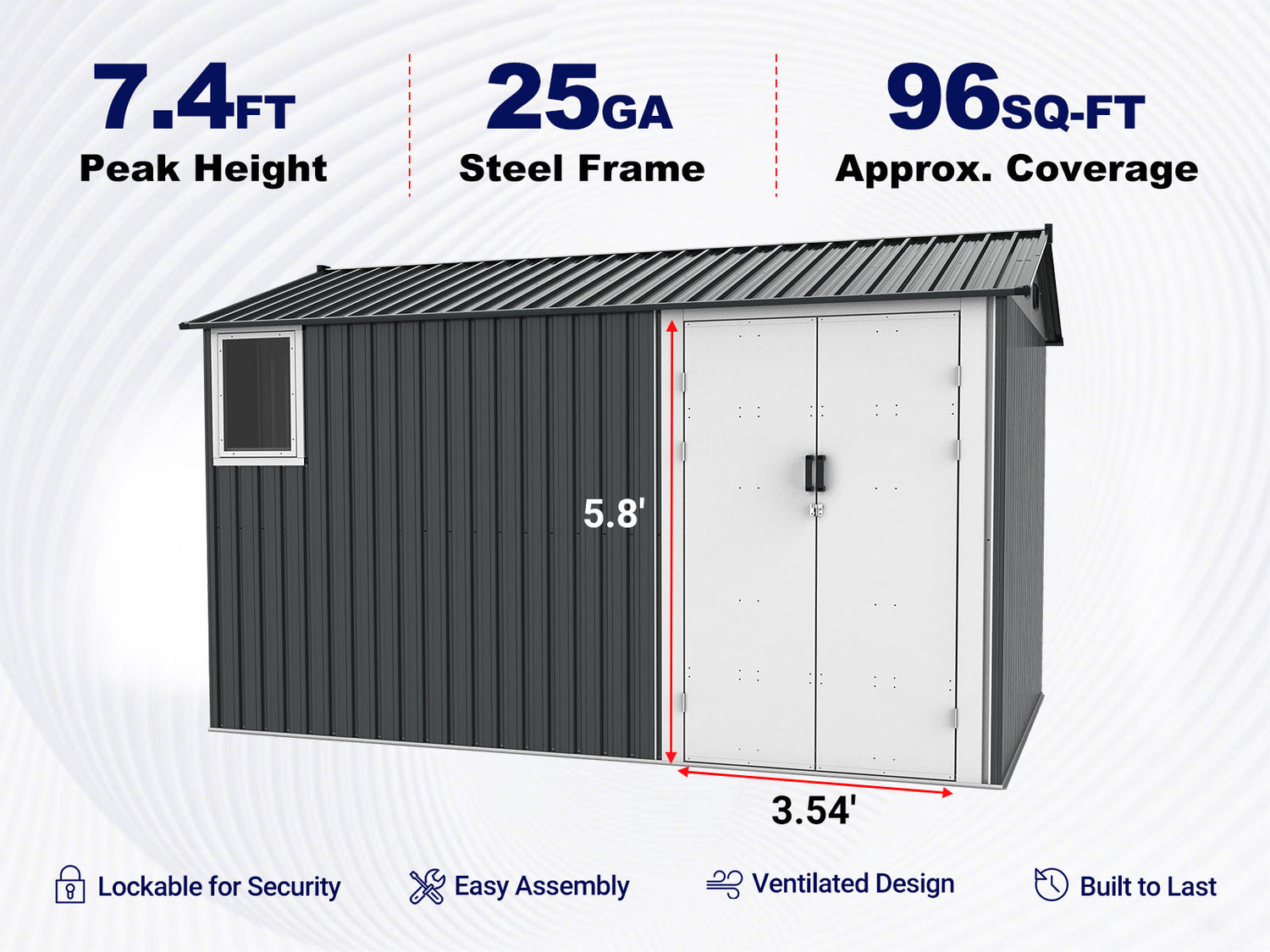 Enhanced Airflow: With a front window and 4 vents, the 8x12 metal shed allows natural light through while improving air circulation and preventing mildew build-up.