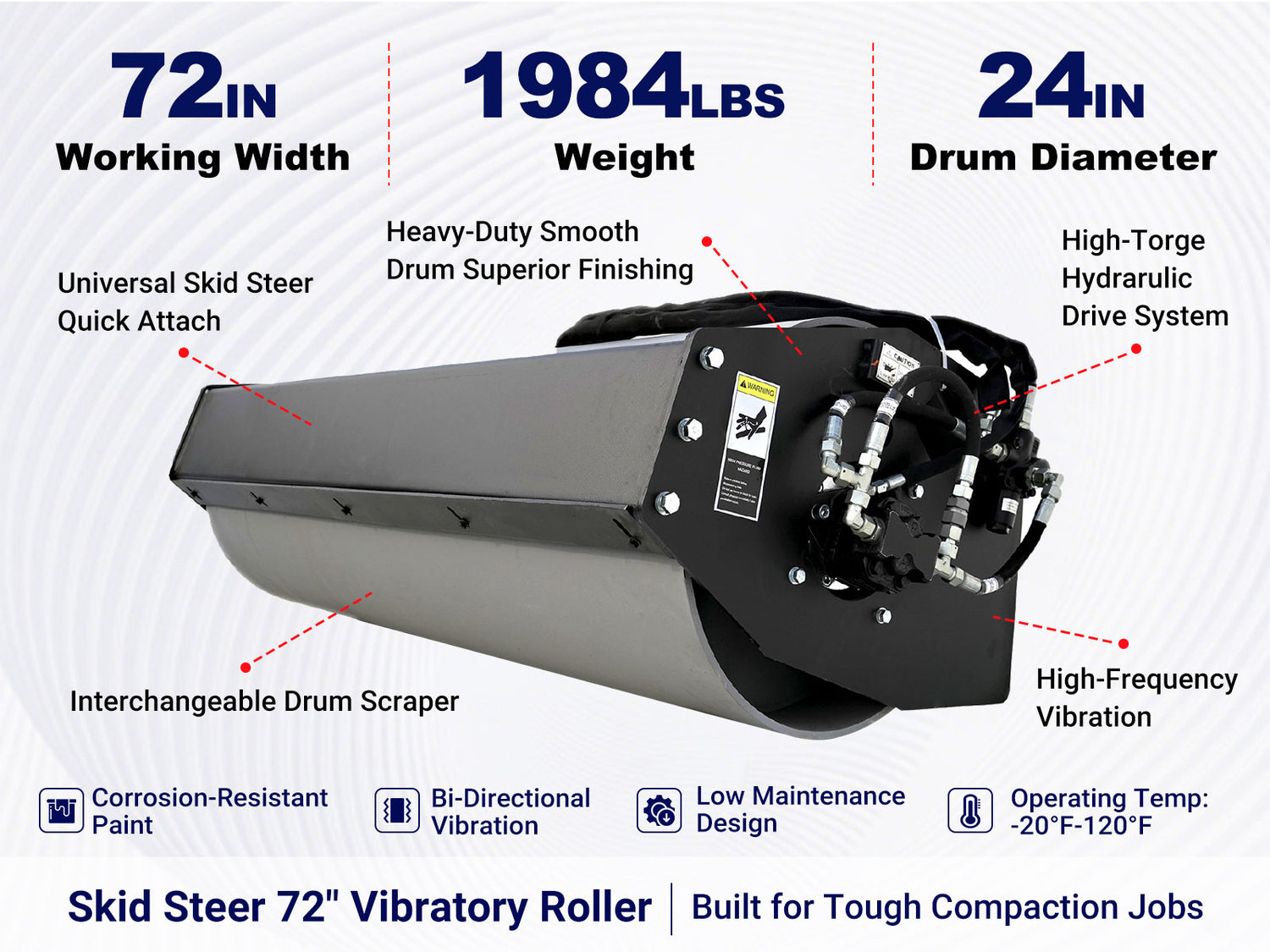 This Greatbear Skid Steer Vibratory Roller attaches to skid steer loaders to compact soil, gravel, asphalt and concrete. It is widely used for roads, foundations, landscaping, walkways, golf courses, parking lots and other commercial and residential job sites where firm, stable surfaces are required. Also known as a roller compactor or road roller, this attachment uses the weight of your skid steer together with vibration force to effectively compress and stabilize various surfaces. Built for heavy-duty operation, it helps increase productivity while delivering reliable performance in tough working conditions.
