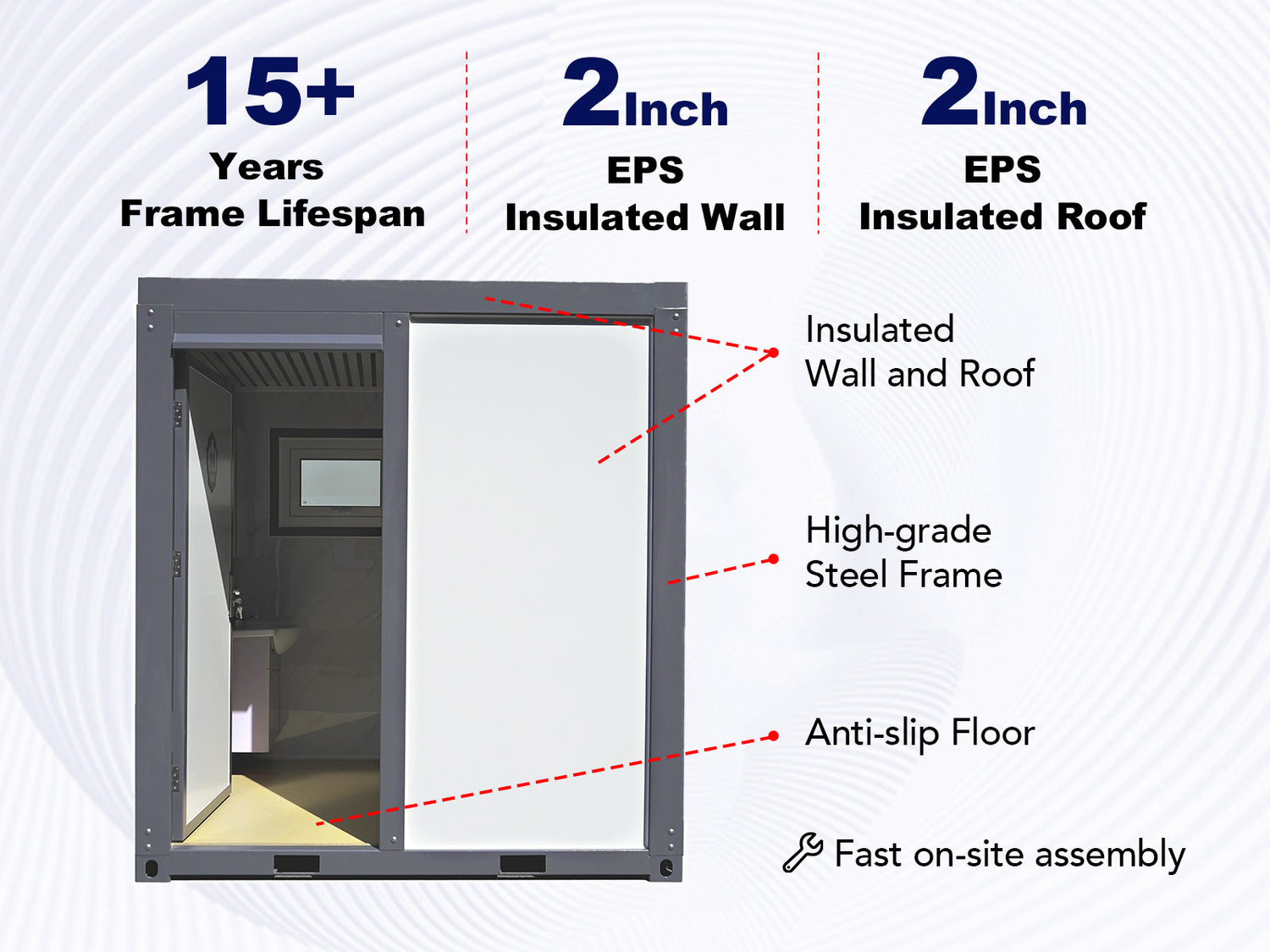 - If used on a construction site, we recommend you connect toilets to the sanitary sewer system and connect water to the pipe system. If not, you may need tanks outside the structure for waste.